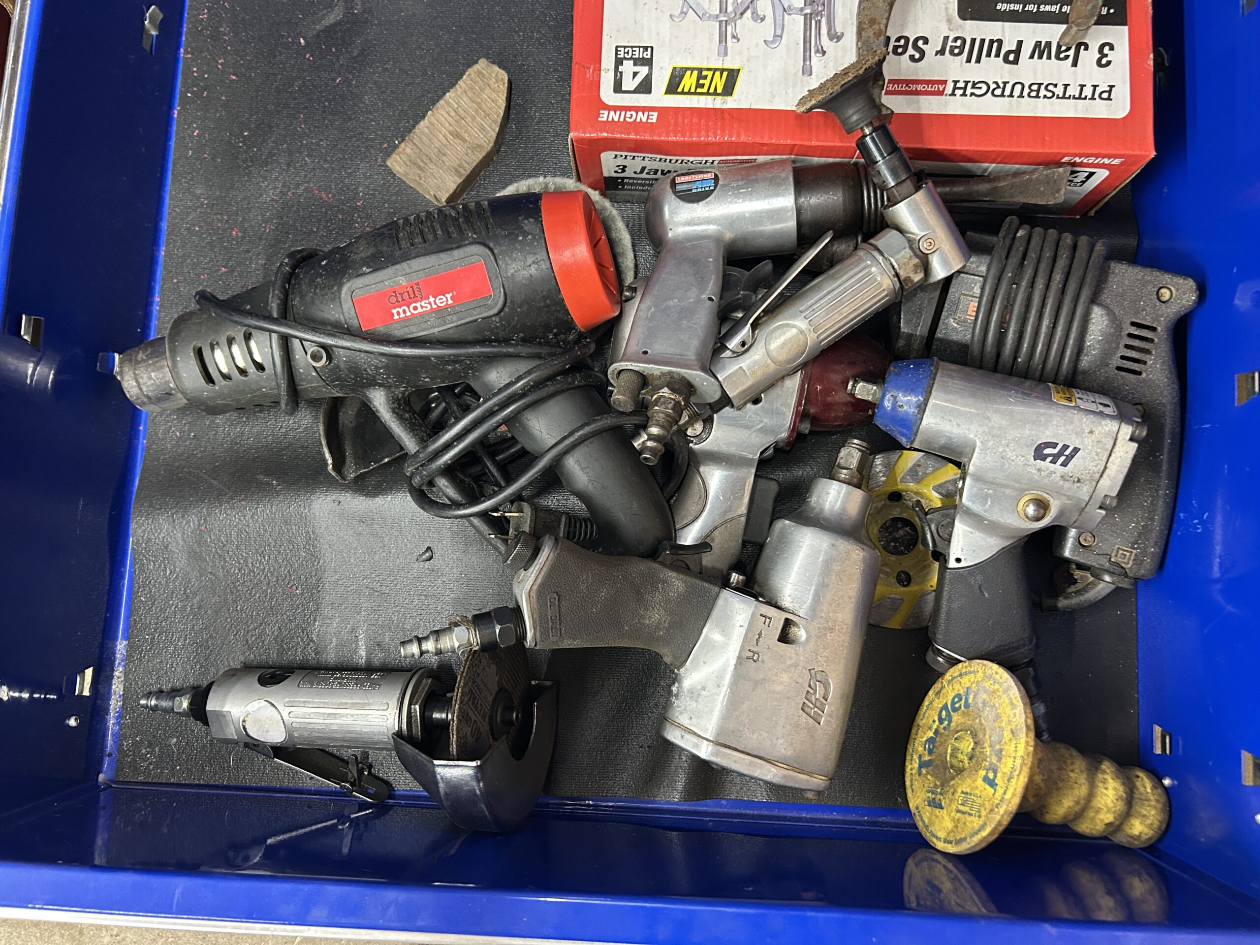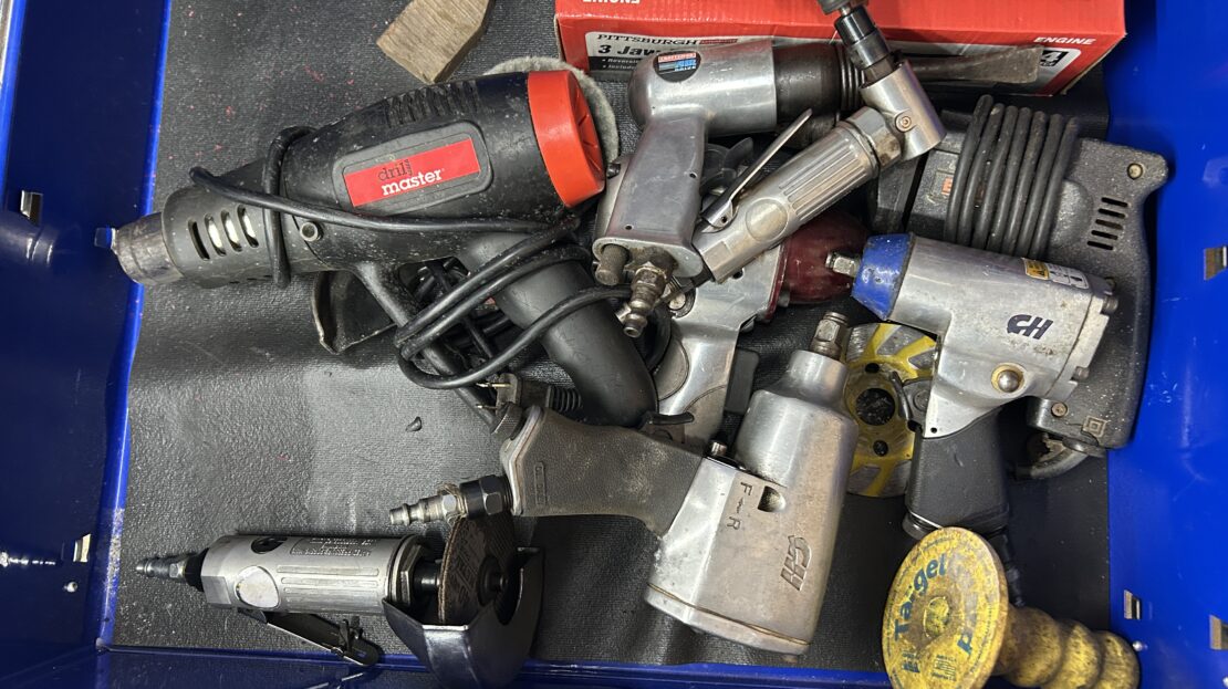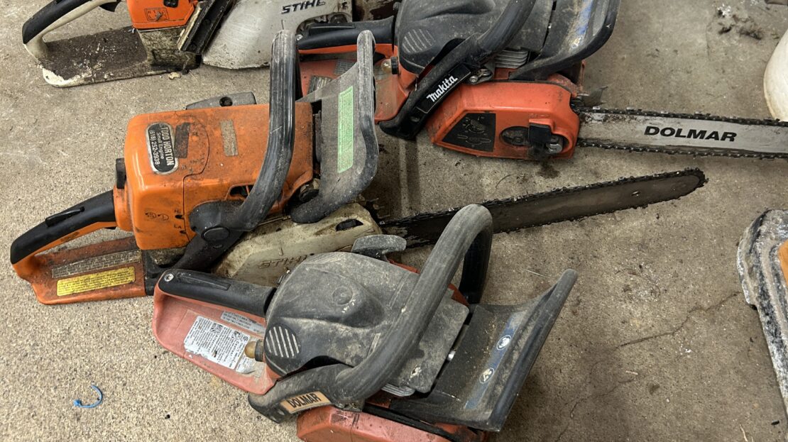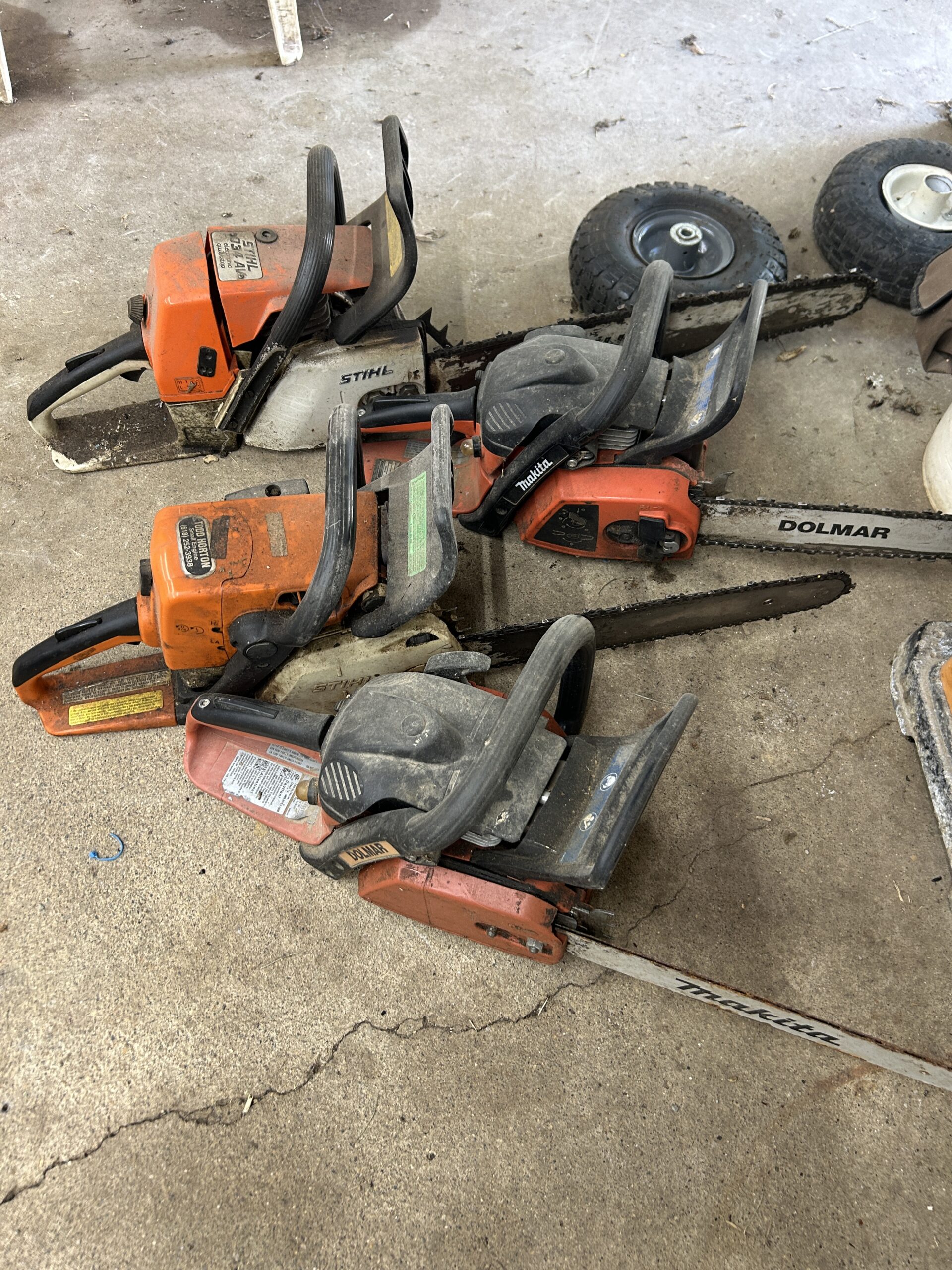 SHOP ITEMS: Stihl & Makita Chainsaws; Air Powered Impact Wrenchers; Air Compressor 2.5 hp; Small Shop Lift; Pittsburg Brand Remote Control Electric Hoist; Power Mig 130 Welder; Craftsman Welder; Grinder; Floor Jack; Airless Paint Sprayer; Battery Powered & Corded Tools; Limb Trimmer; Weed Eaters; Deluxe Fan; US General Tool Box (like new); Pittsburg & Craftsman Sockets & Wrenches; Shop Vac; 8 Drawer Wooden Tool Chest; Central Pneumatics Wrenches; Doly; Gas Cans; Truck Tool Box; Multi -Purpose LP Cooker; Misc. Tools; Coleman Igloo Cooler; Assorted Scrap Metal; & Pet Carriers