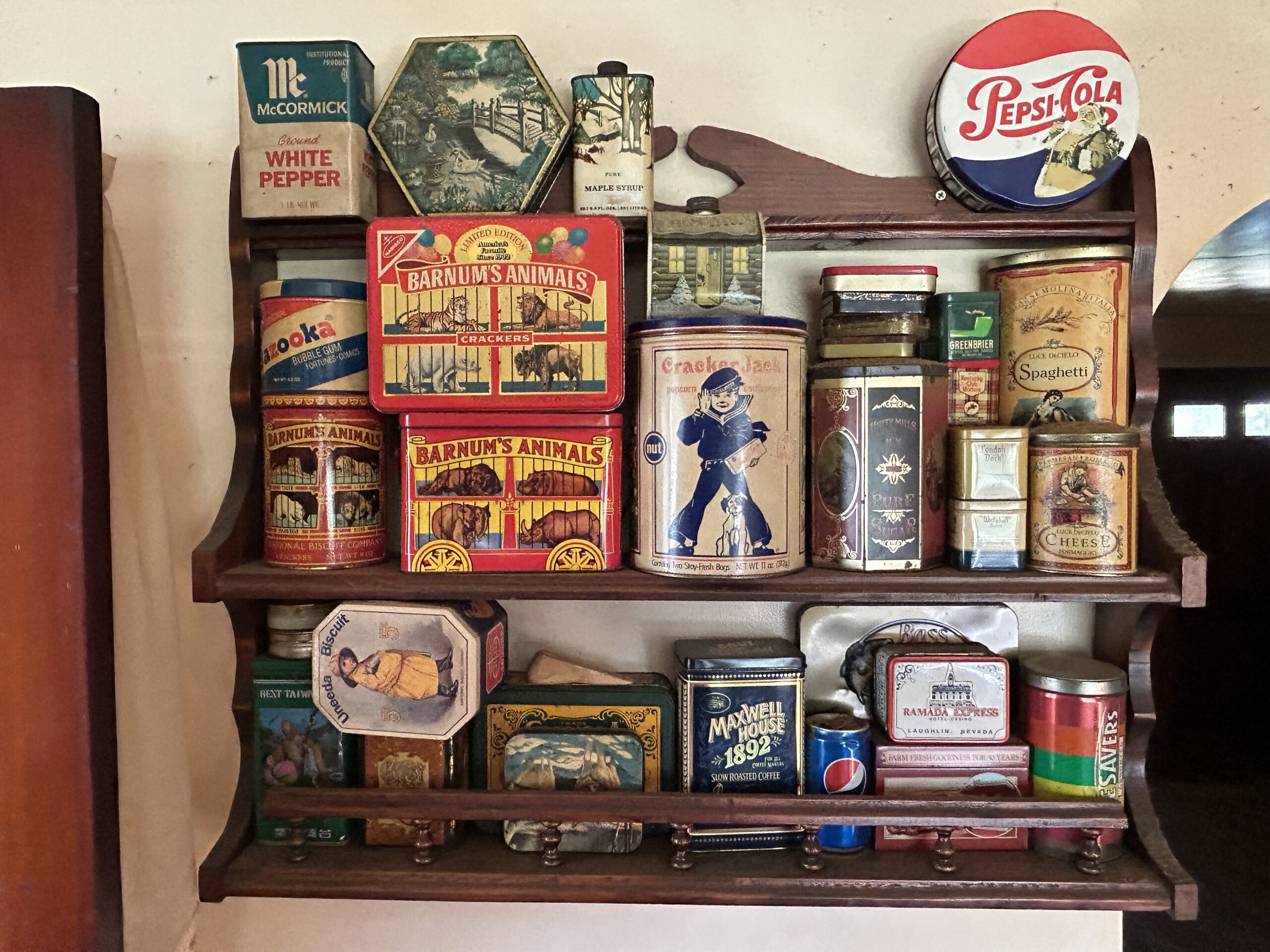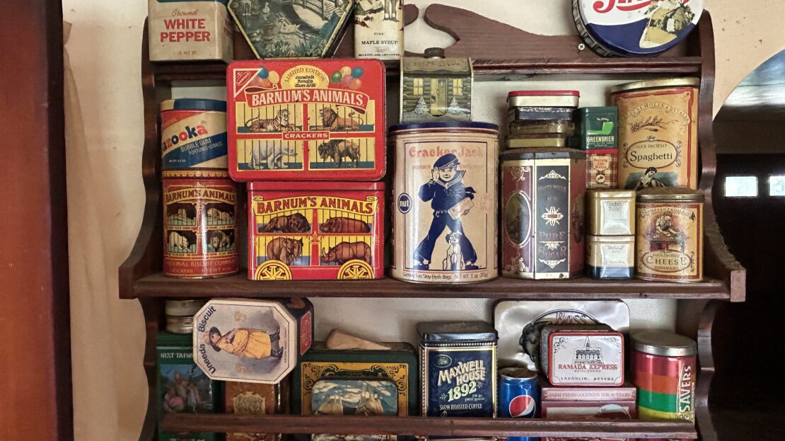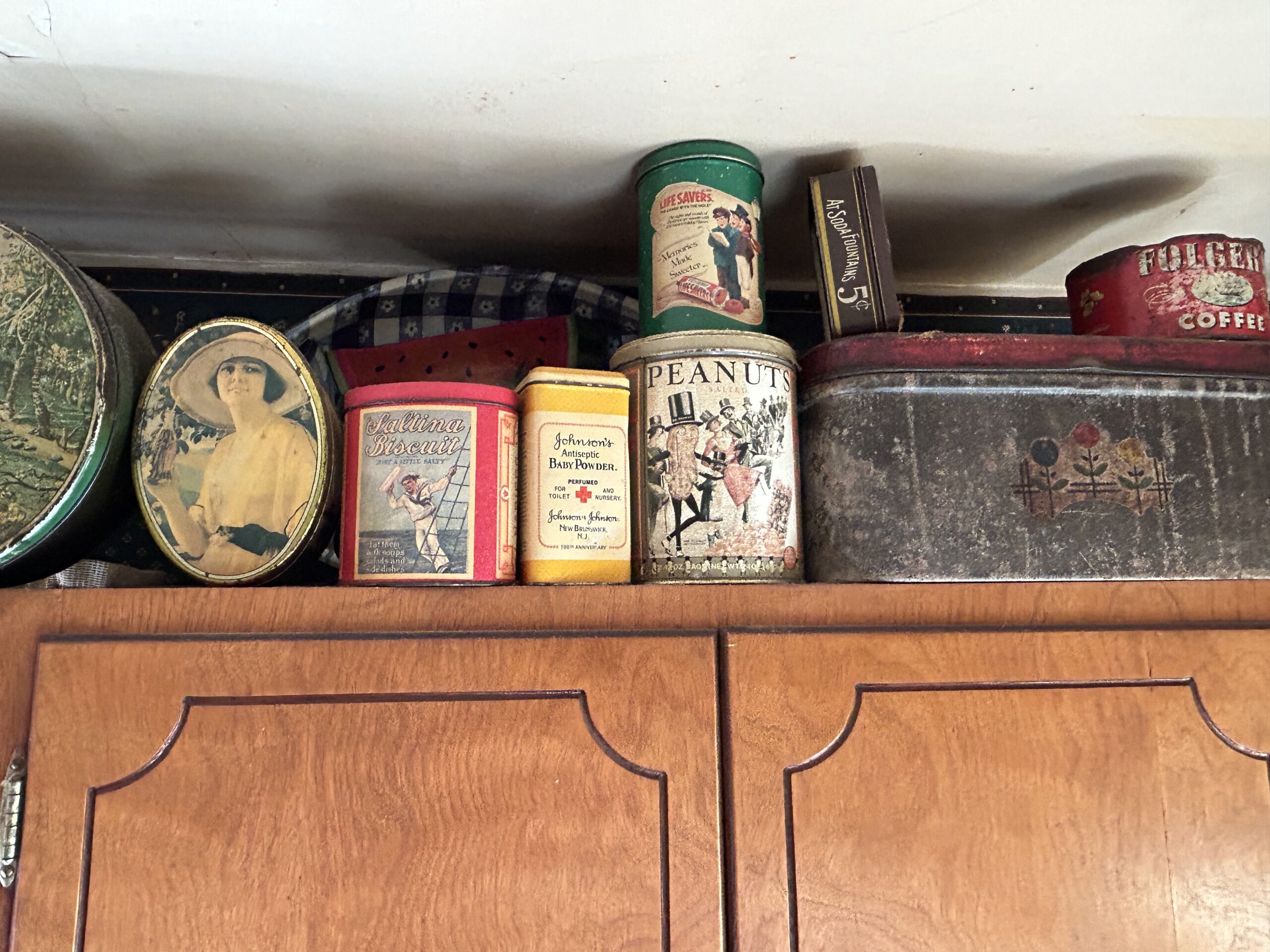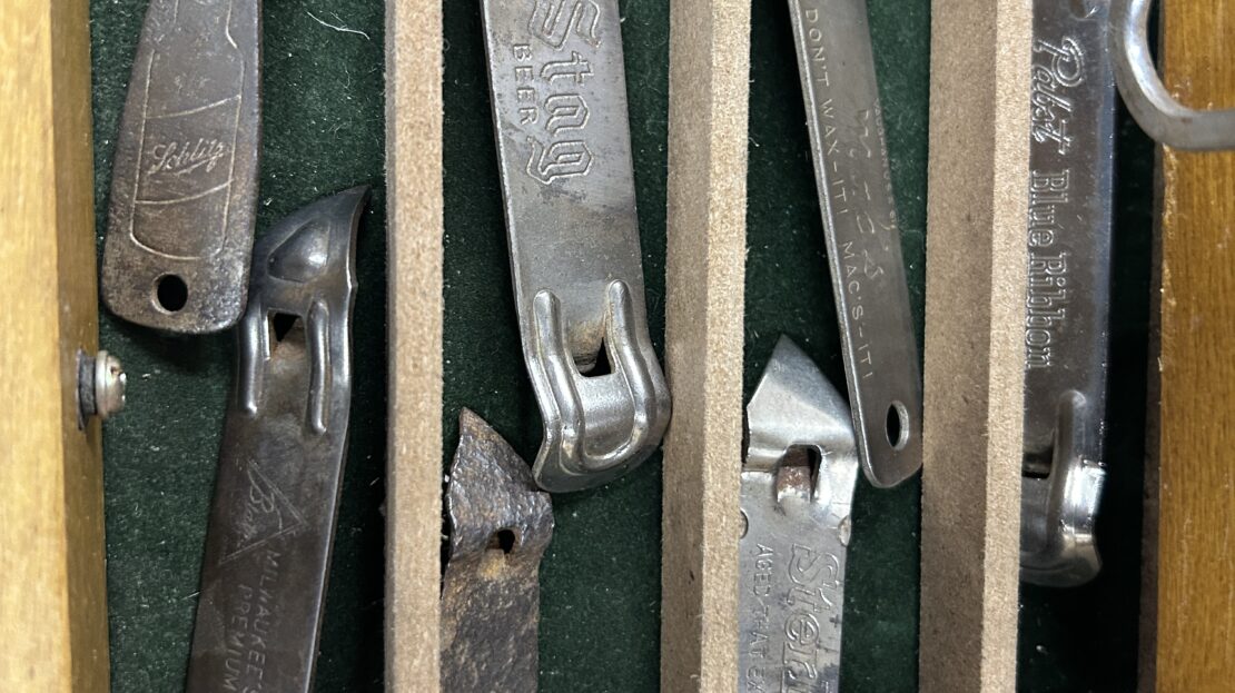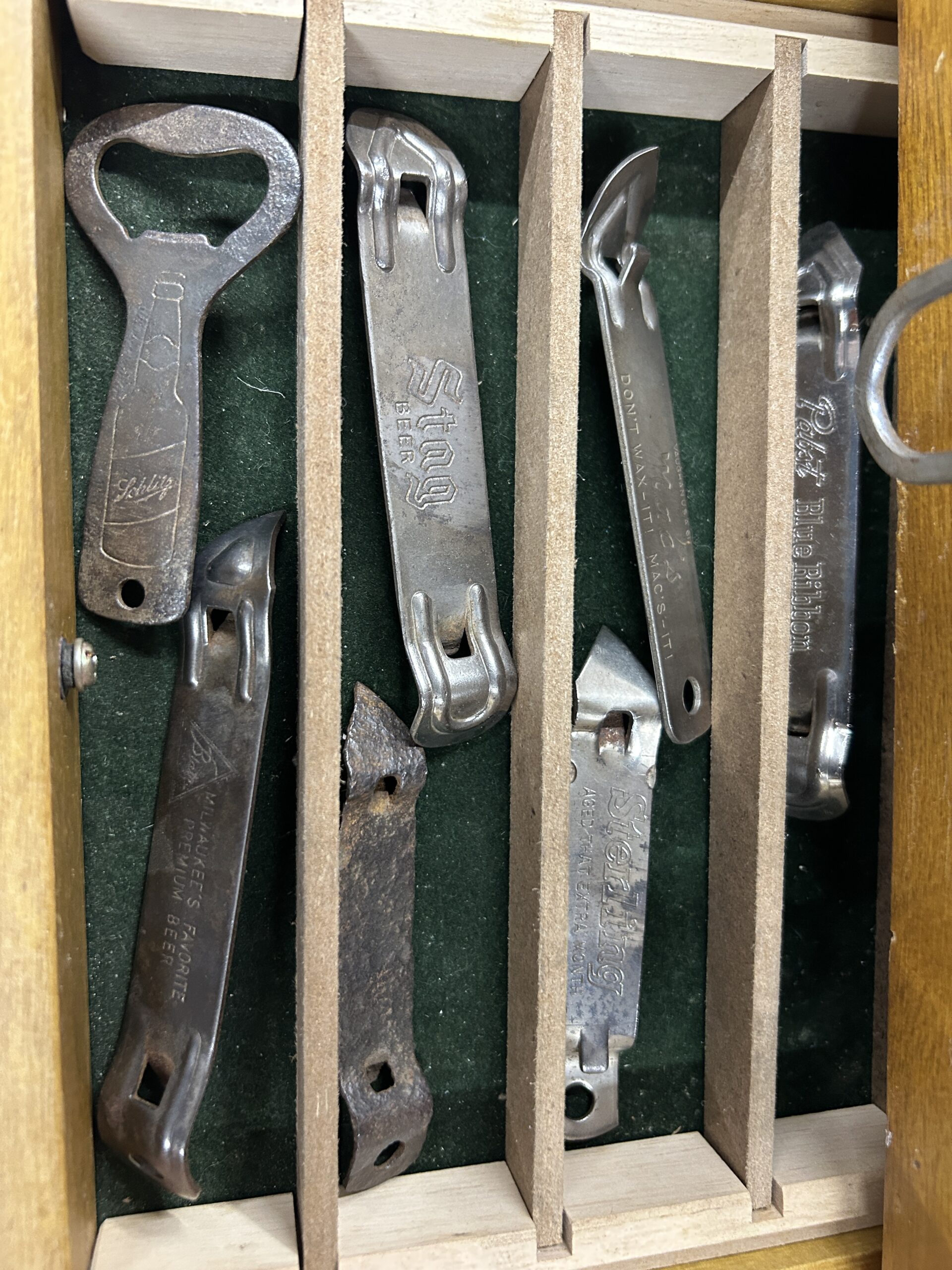 COLLECTIBLES: Large Tin Collection; Trinkets; Cigarette Lighters; Bottle Openers (Stagg; Pabst; Schlitz); License Plates; Coca Cola Lamp; Cassette Tapes; 3 Milk Cans; Pictures; & Pitcher & Bowl