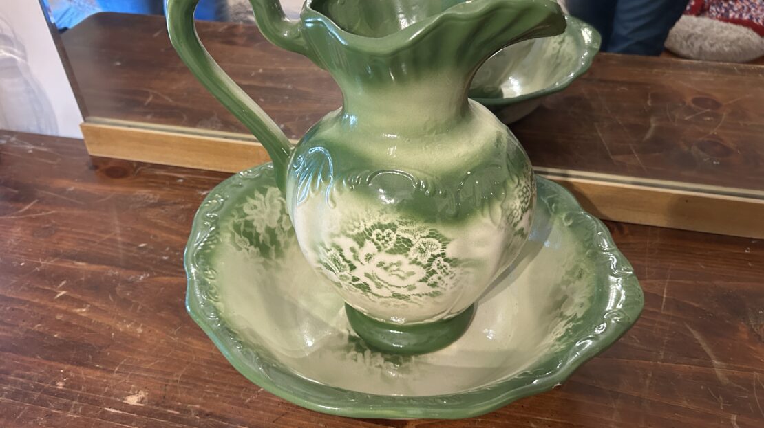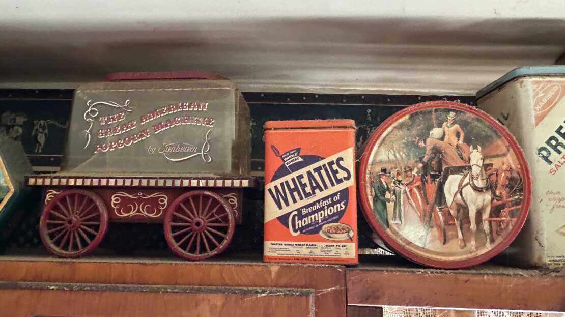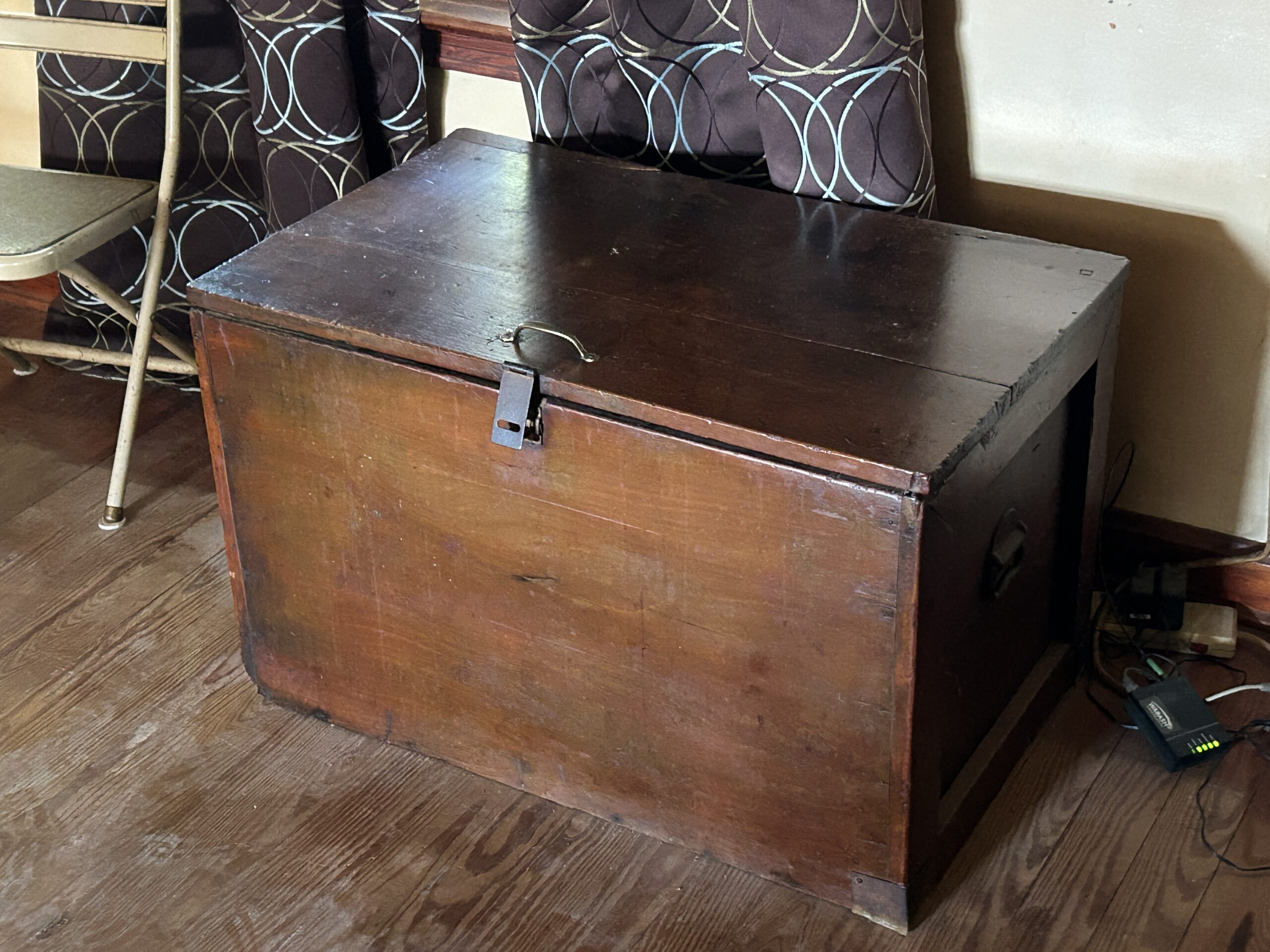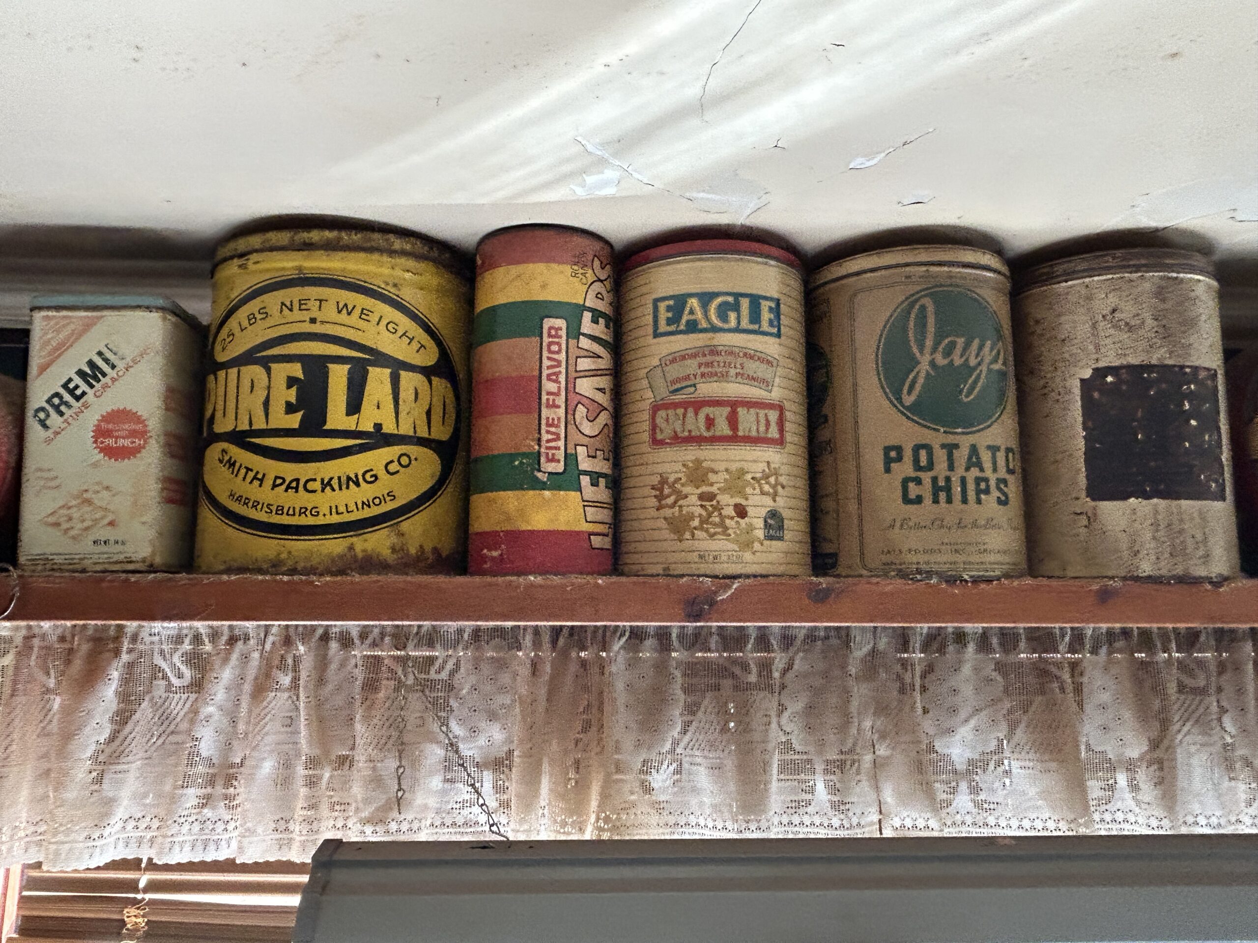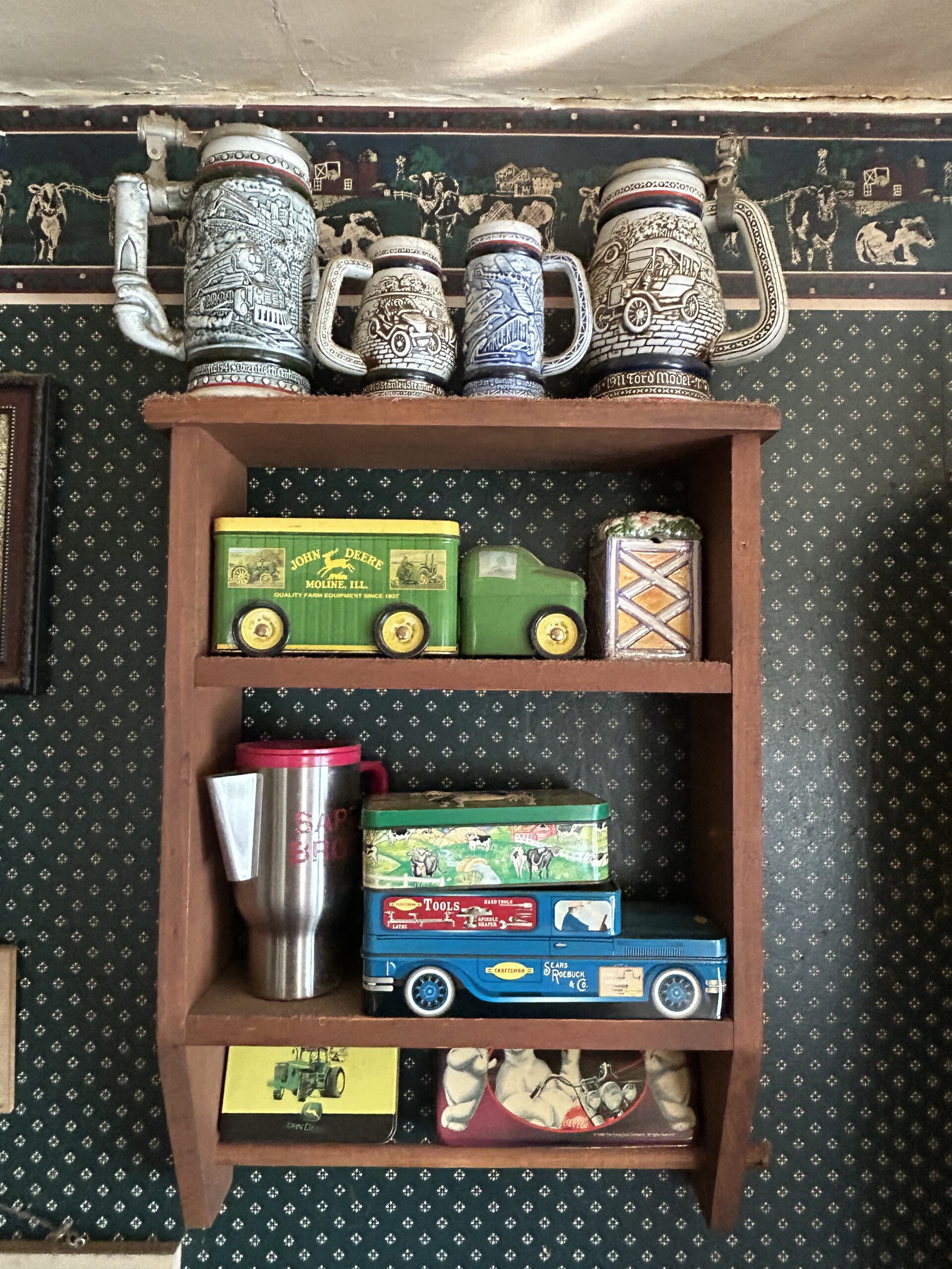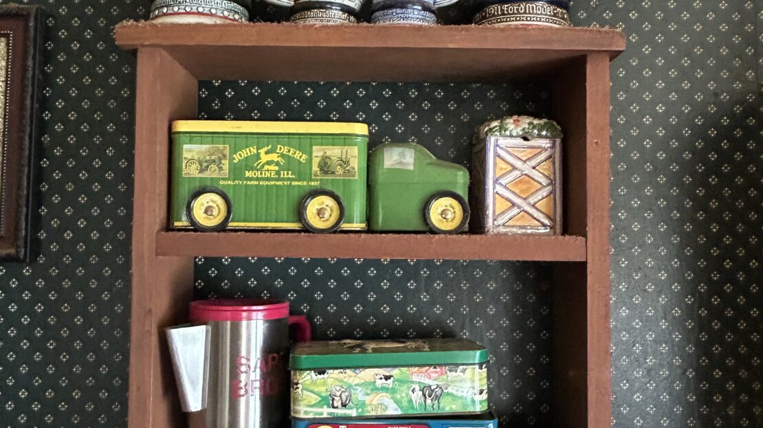 OTHER ITEMS: Old Corner Curio Cabinet; Wooden Storage Box; Small Filing Cabinet; Old Dresser & Chest of Drawers; Misc. Dishes; Storage Cabinet; John Deere Cannister Set; “Log Cabin” Bread Box; Desk Light, & Wooden Kitchen Cabinet