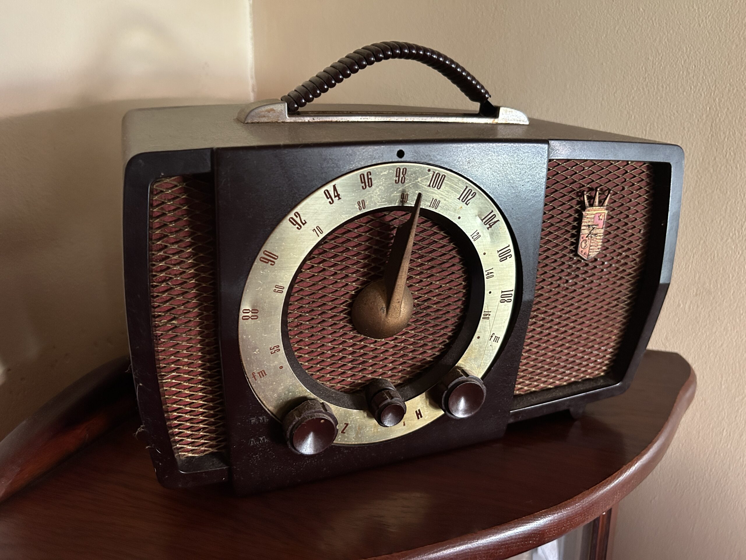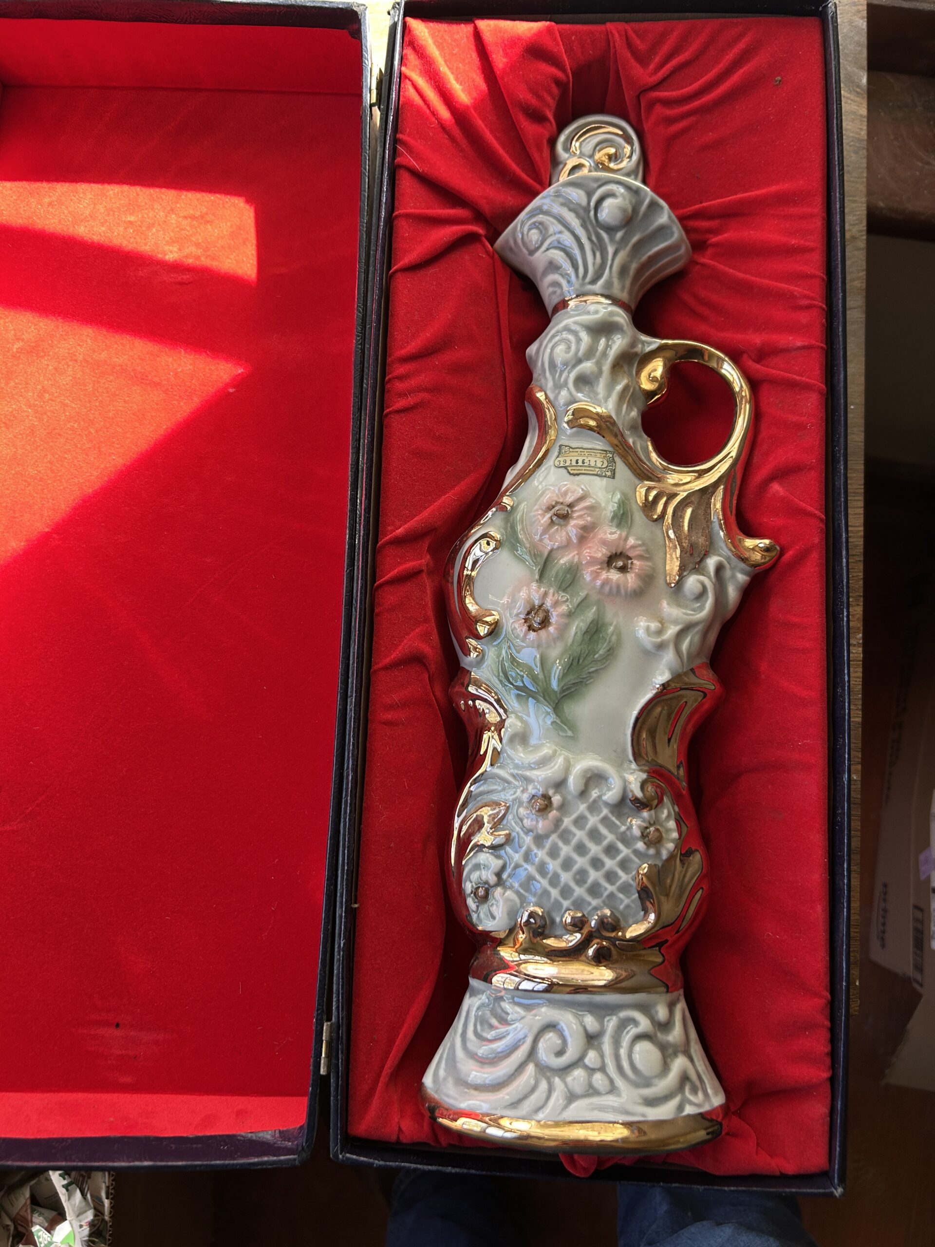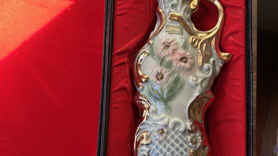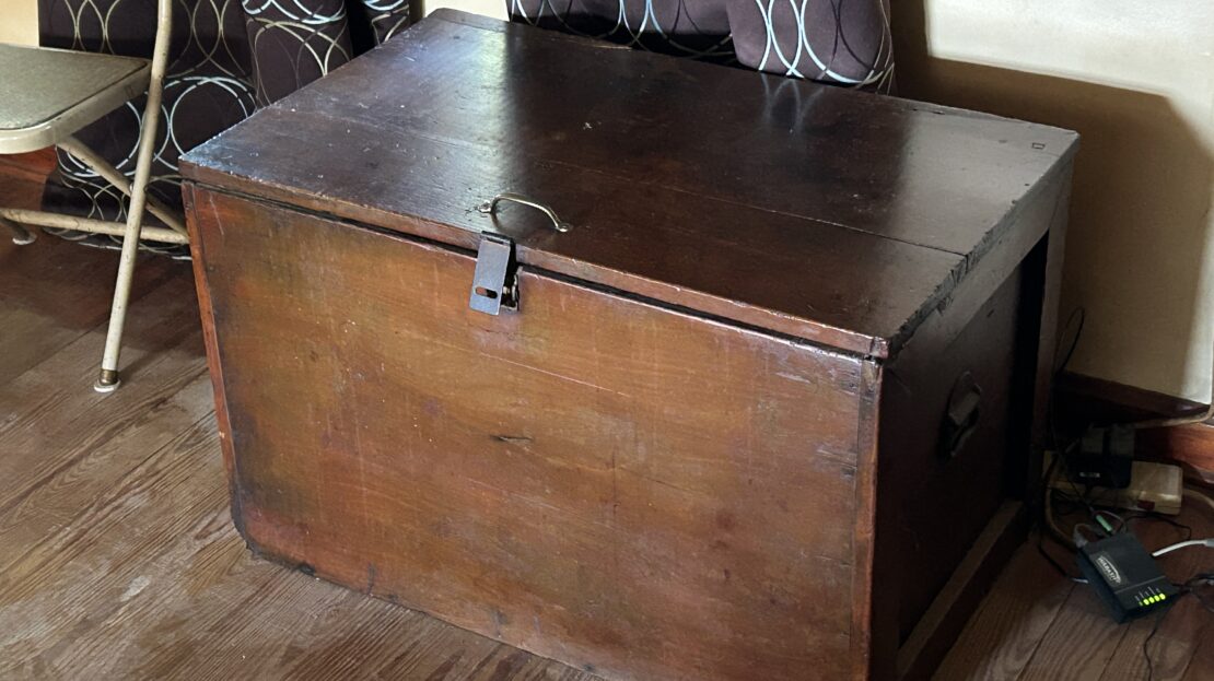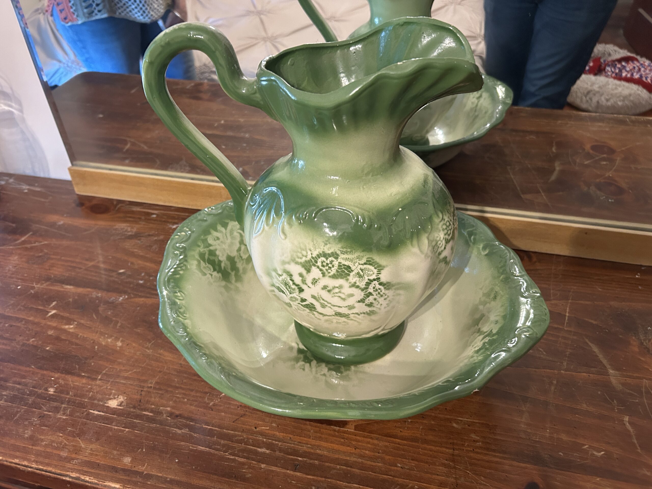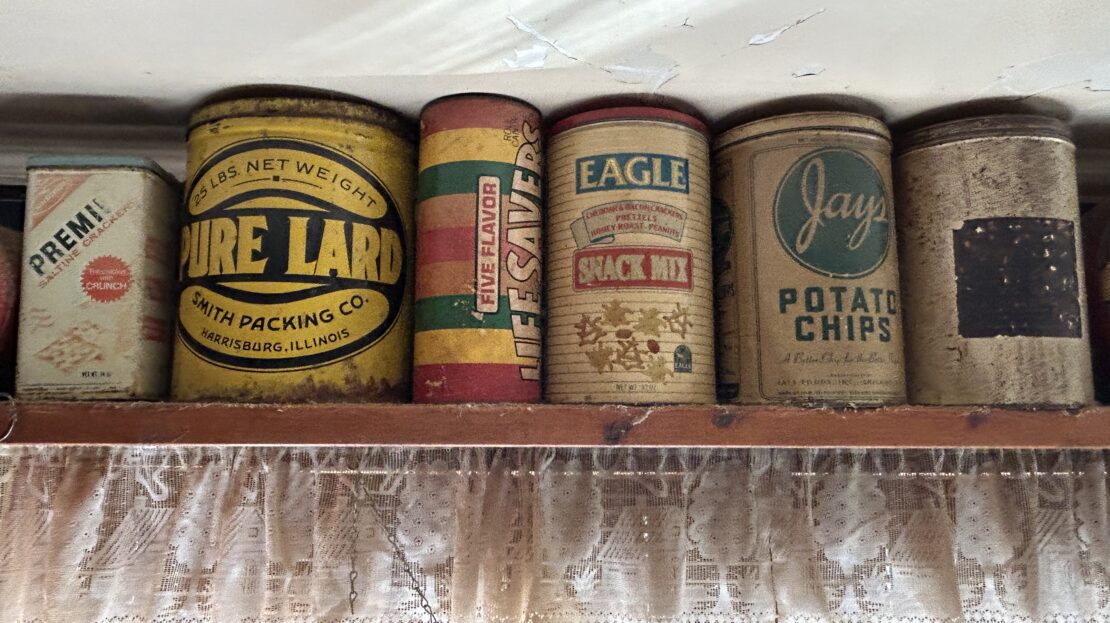 OTHER ITEMS: Old Corner Curio Cabinet; Wooden Storage Box; Small Filing Cabinet; Old Dresser & Chest of Drawers; Misc. Dishes; Storage Cabinet; John Deere Cannister Set; “Log Cabin” Bread Box; Desk Light, & Wooden Kitchen Cabinet